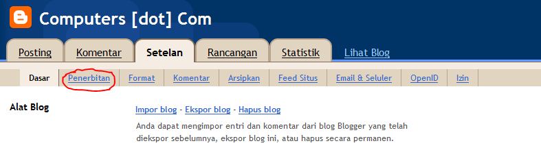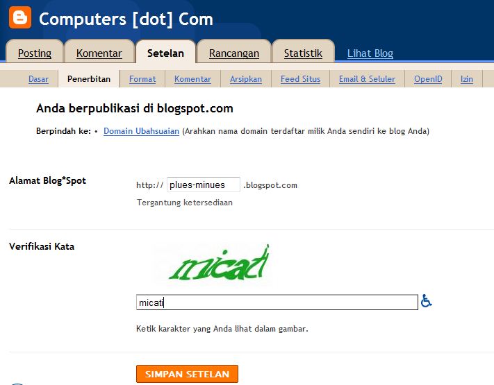 4. Setelah anda klik Penerbitan/Publishing maka anda akan di bawa ke halaman seperti gambar di bawah ini. Pada halaman tab “Publishing Settings” anda dapat dua pilihan untuk merubah nama URL Blog anda. Yang kesatu adalah memasukkan nama domain yang anda beli, nama domain tersebut tidak tercantum nama “blogspot” nya diakhir URL. Yang kedua adalah memasukkan nama domain yang anda suka pada kotak yang disediakan, masih gratis tetapi tetap tercantum nama “blogspot” di akhir URL. Anda perlu check dulu apakah nama yang anda pilih masih tersedia, prosedurnya sama ketika anda pertama kali membuat nama URL anda sewaktu mendaftar account Blogger. Kalau nama URLnya tersedia, maka anda bisa mulai menggunakannya pada saat itu juga.